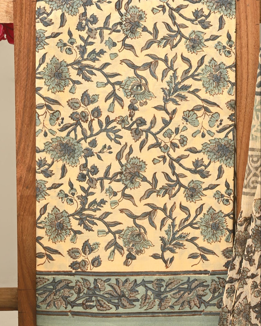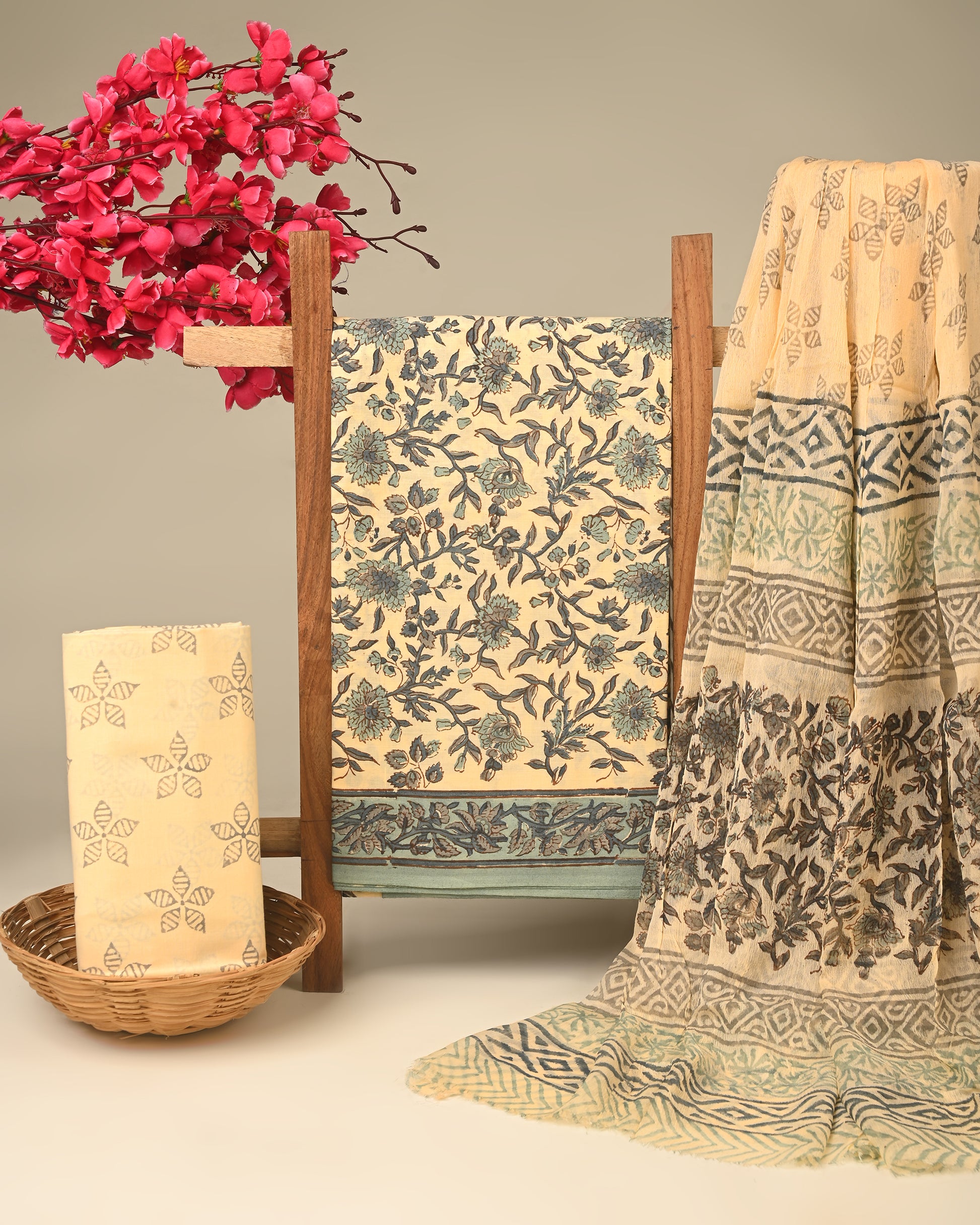 Cream unstitched printed  pure cotton fabric or dress material top and bottom set for women for dress from tanchui having sangeneri print bagru print Jaipuri print