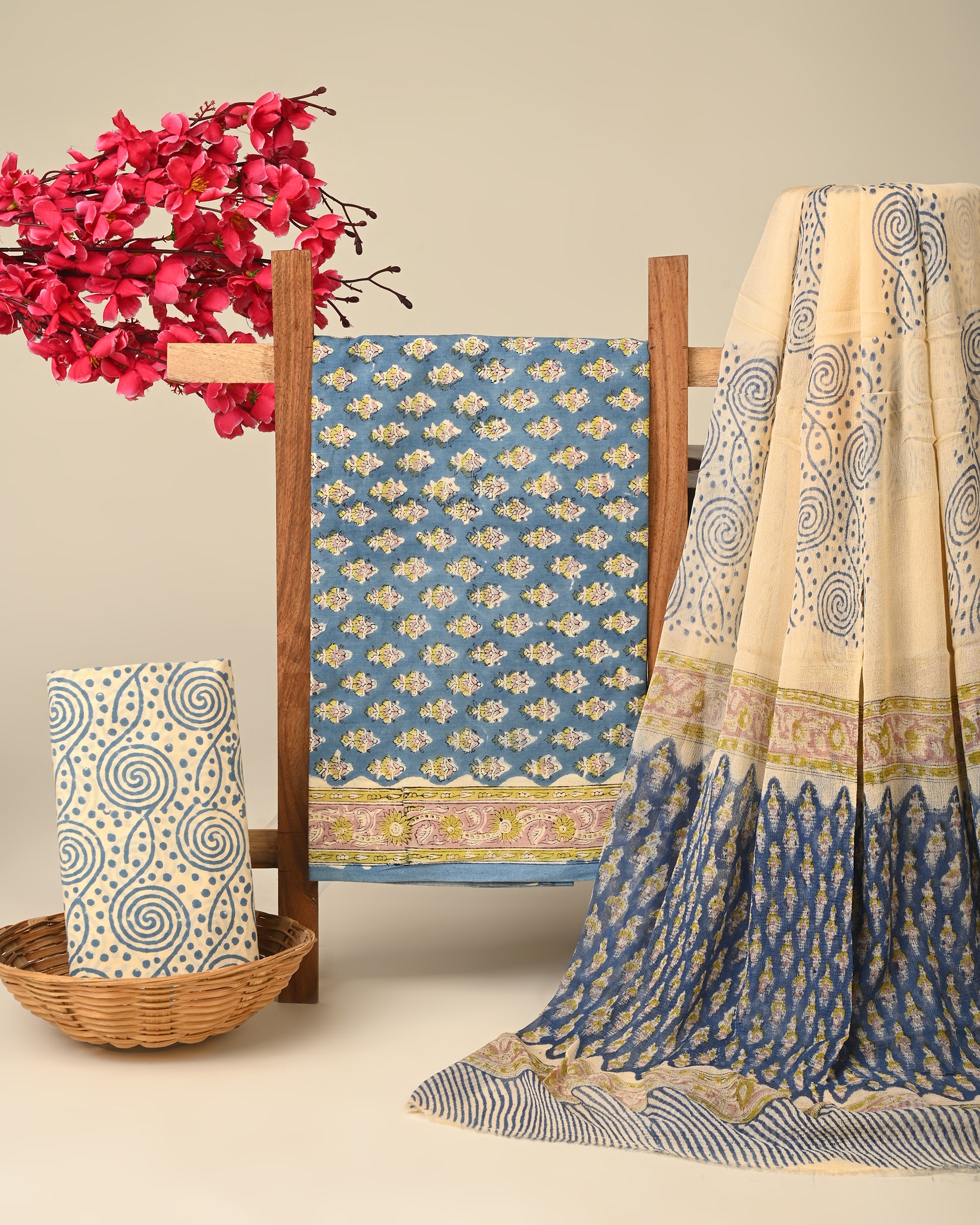 Blue unstitched printed pure cotton fabric or dress material top and bottom set for women for dress from tanchui having sangeneri print bagru print Jaipuri print
