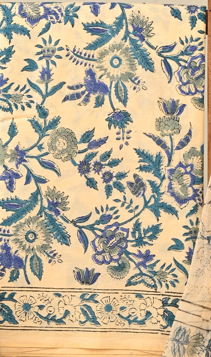 Cream unstitched printed  pure cotton fabric or dress material top and bottom set for women for dress from tanchui having sangeneri print bagru print Jaipuri print