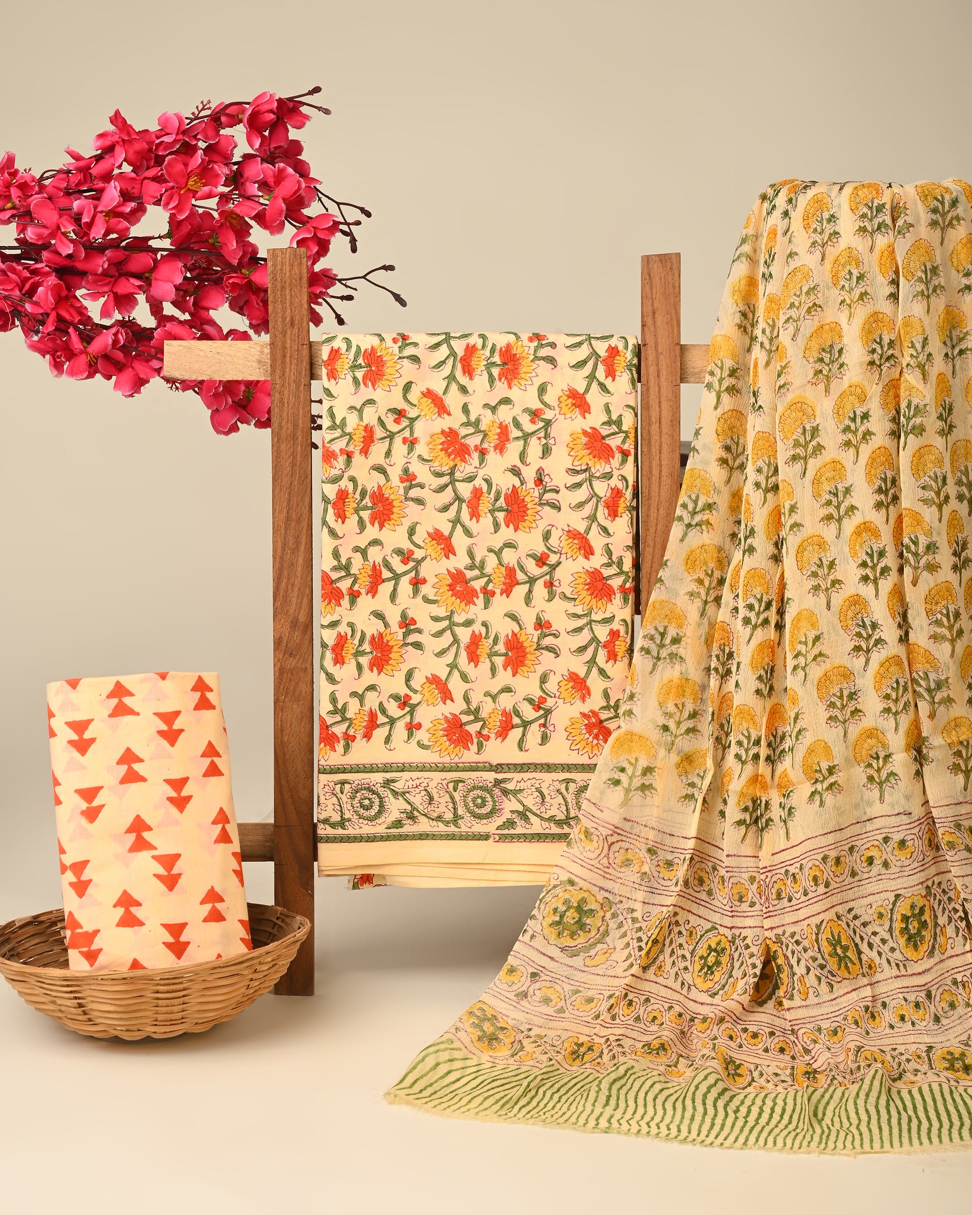 Cream unstitched printed  pure cotton fabric or dress material top and bottom set for women for dress from tanchui having sangeneri print bagru print Jaipuri print