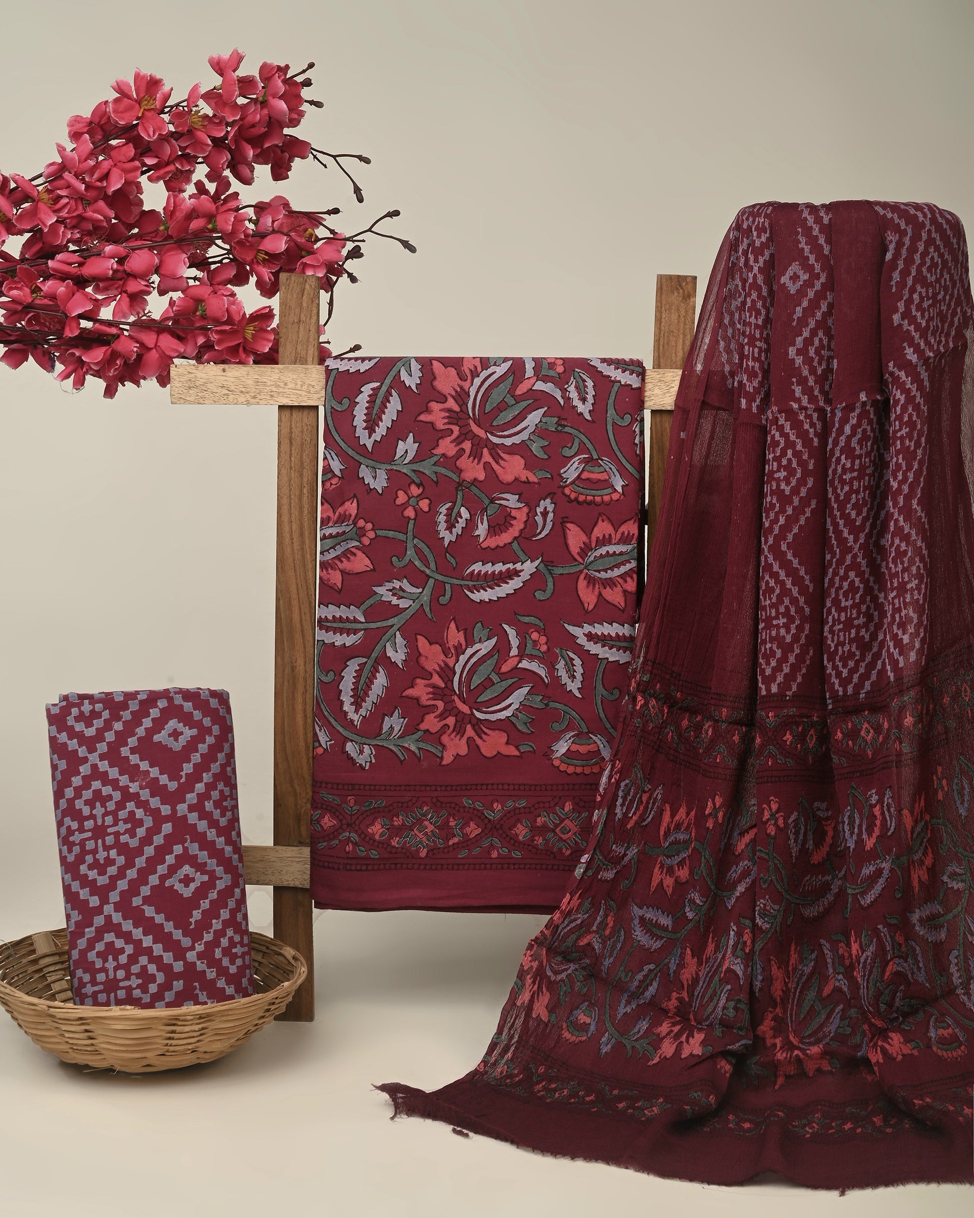 Maroon unstitched printed  pure cotton fabric or dress material top and bottom set for women for dress from tanchui having sangeneri print bagru print Jaipuri print