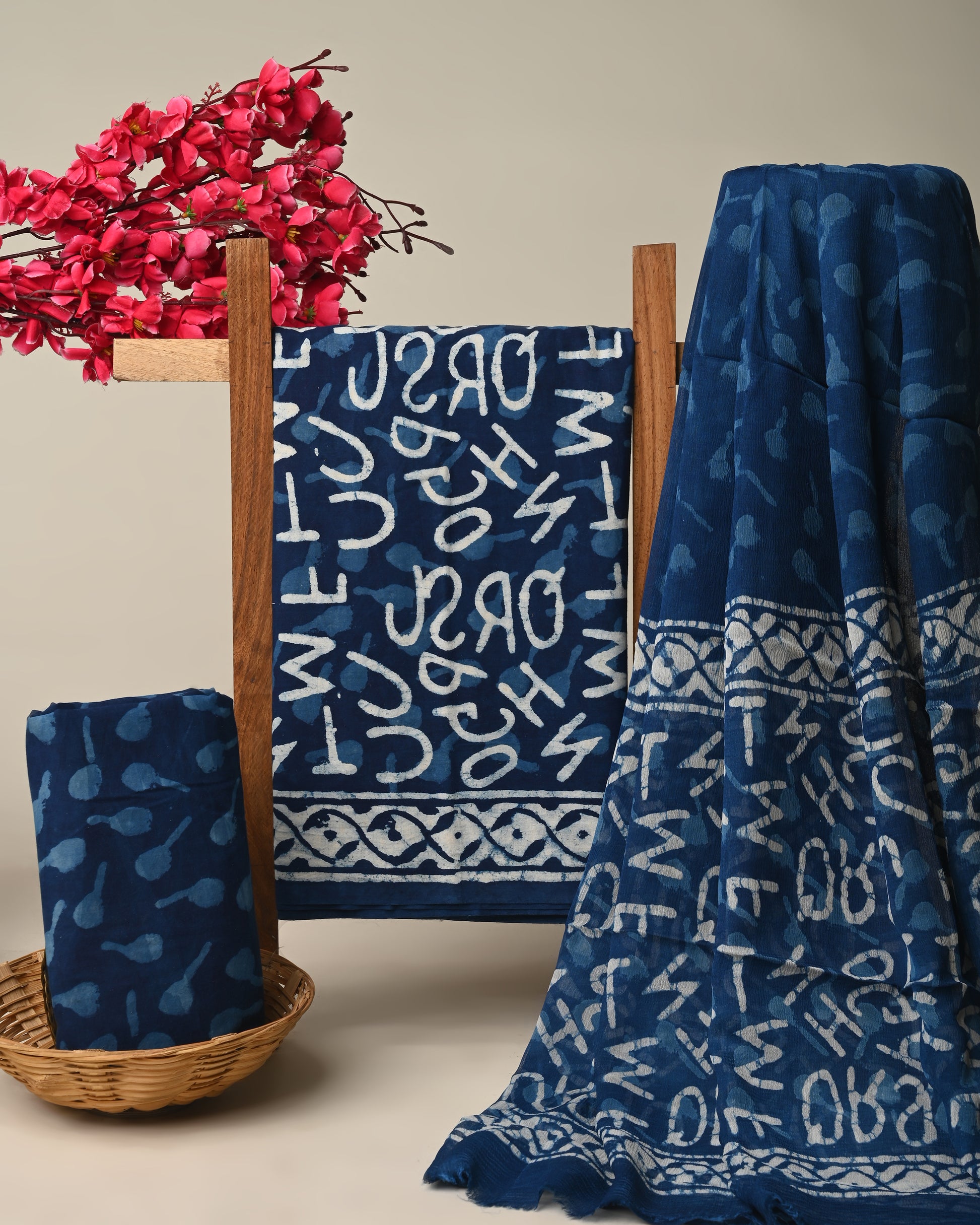 Blue unstitched printed pure cotton fabric or dress material top and bottom set for women for dress from tanchui having sangeneri print bagru print Jaipuri print