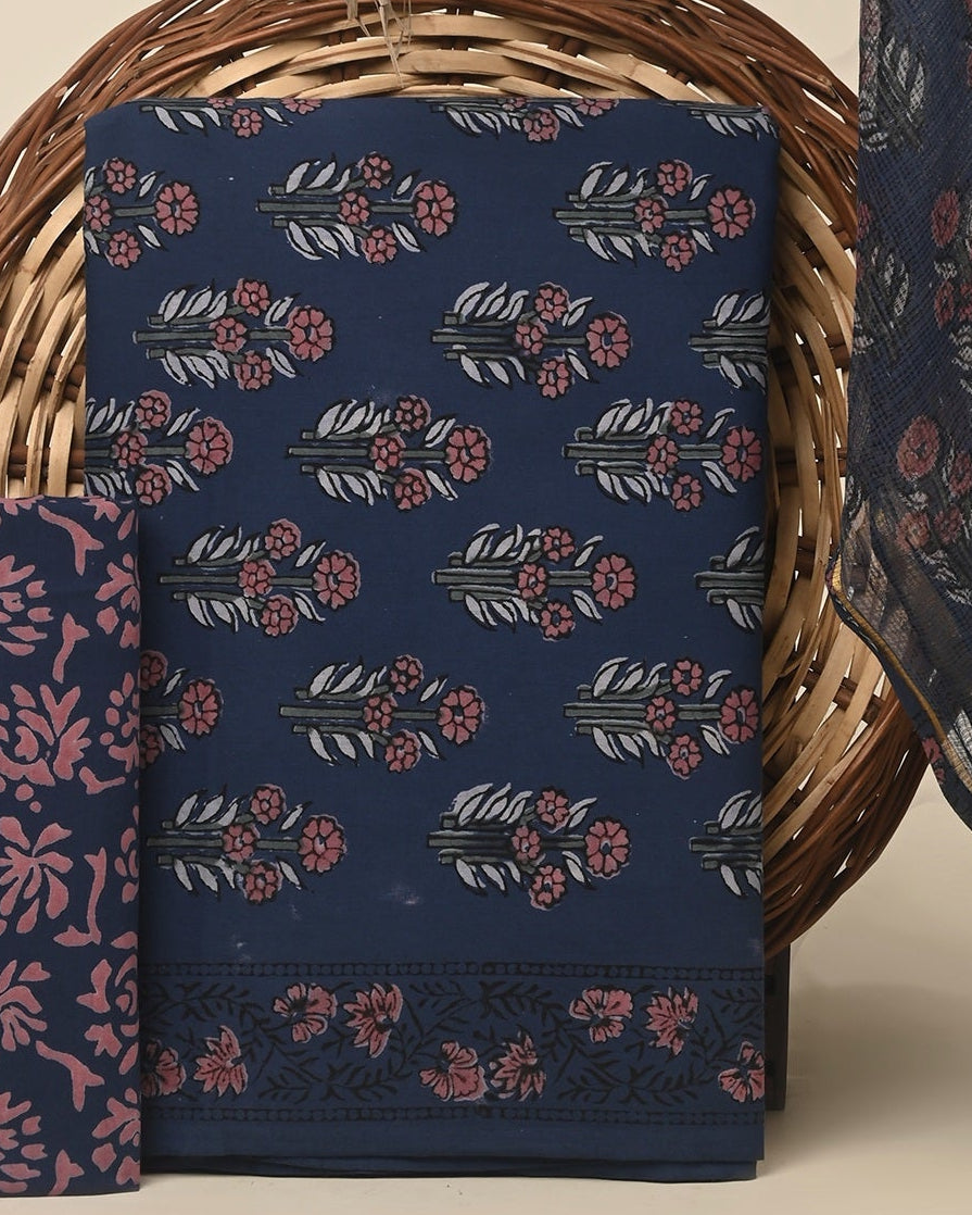 Blue unstitched printed pure cotton fabric or dress material top and bottom set for women for dress from tanchui having sangeneri print bagru print Jaipuri print