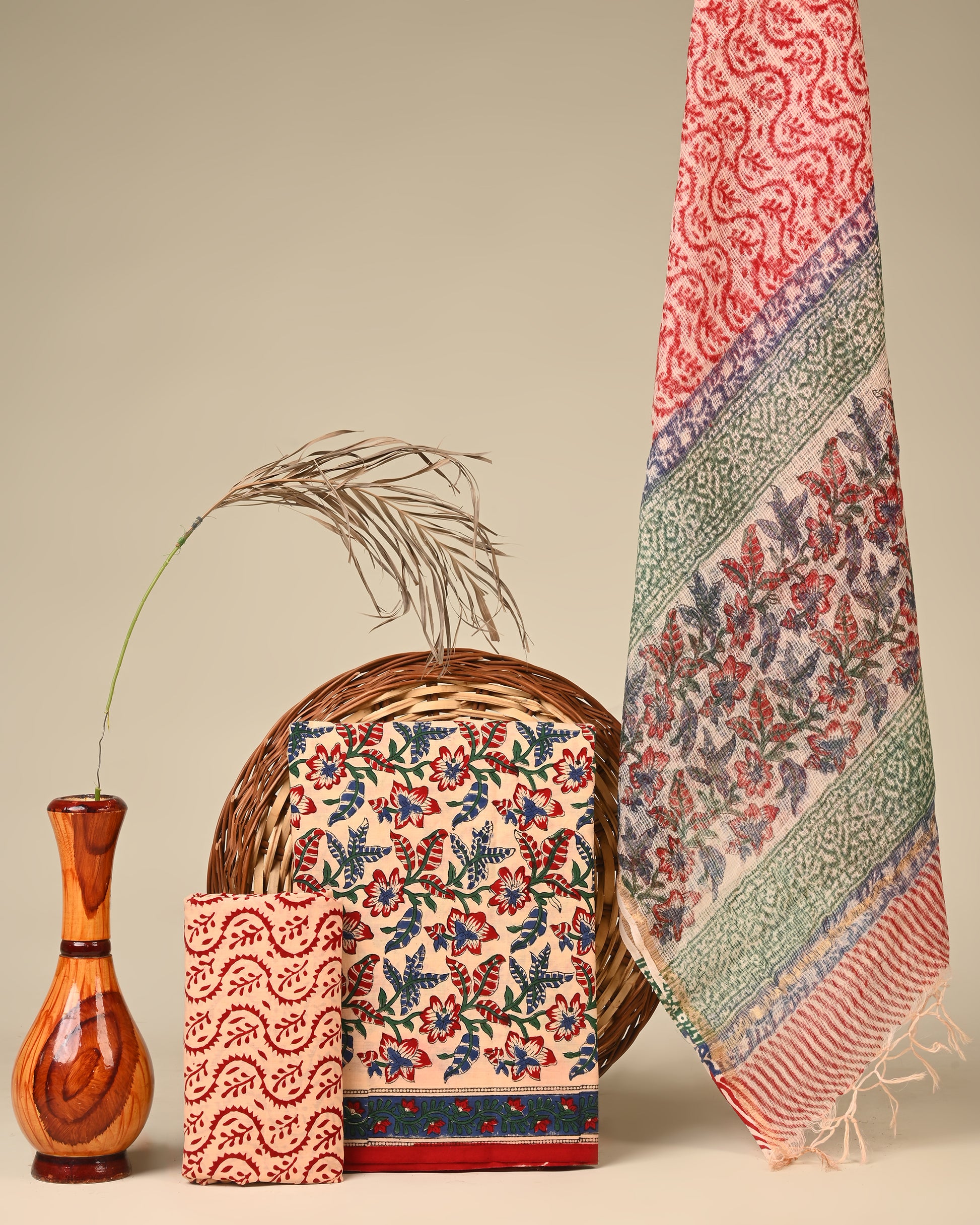 Cream unstitched printed  pure cotton fabric or dress material top and bottom set for women for dress from tanchui having sangeneri print bagru print Jaipuri print