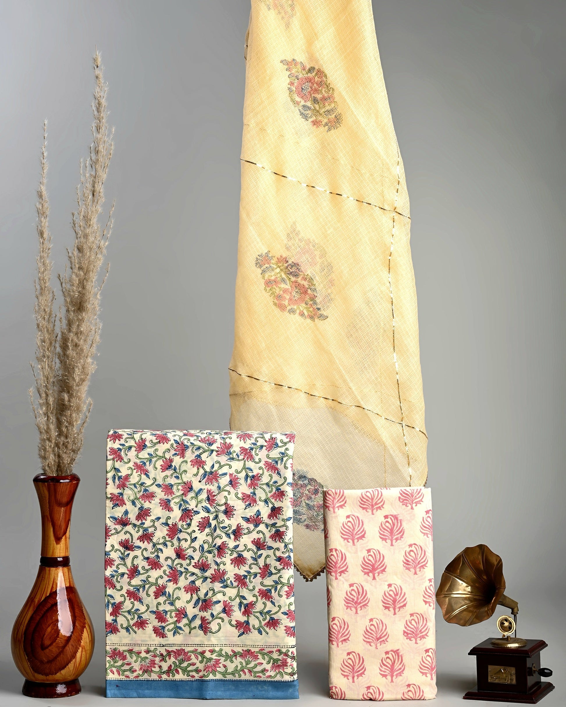 A Trendy KOTA DORIYA LACE DUPATTA SUIT which having traditional gotta lace work on dupatta with pure cotton hand block printed top and bottom to wear At Parties, Functions Or Just Casually Which Is Stylish & comfortable To Wear For Women Or This Suit And You Will Be A Fashion Statement Every Time with Brand Of Tanchui.