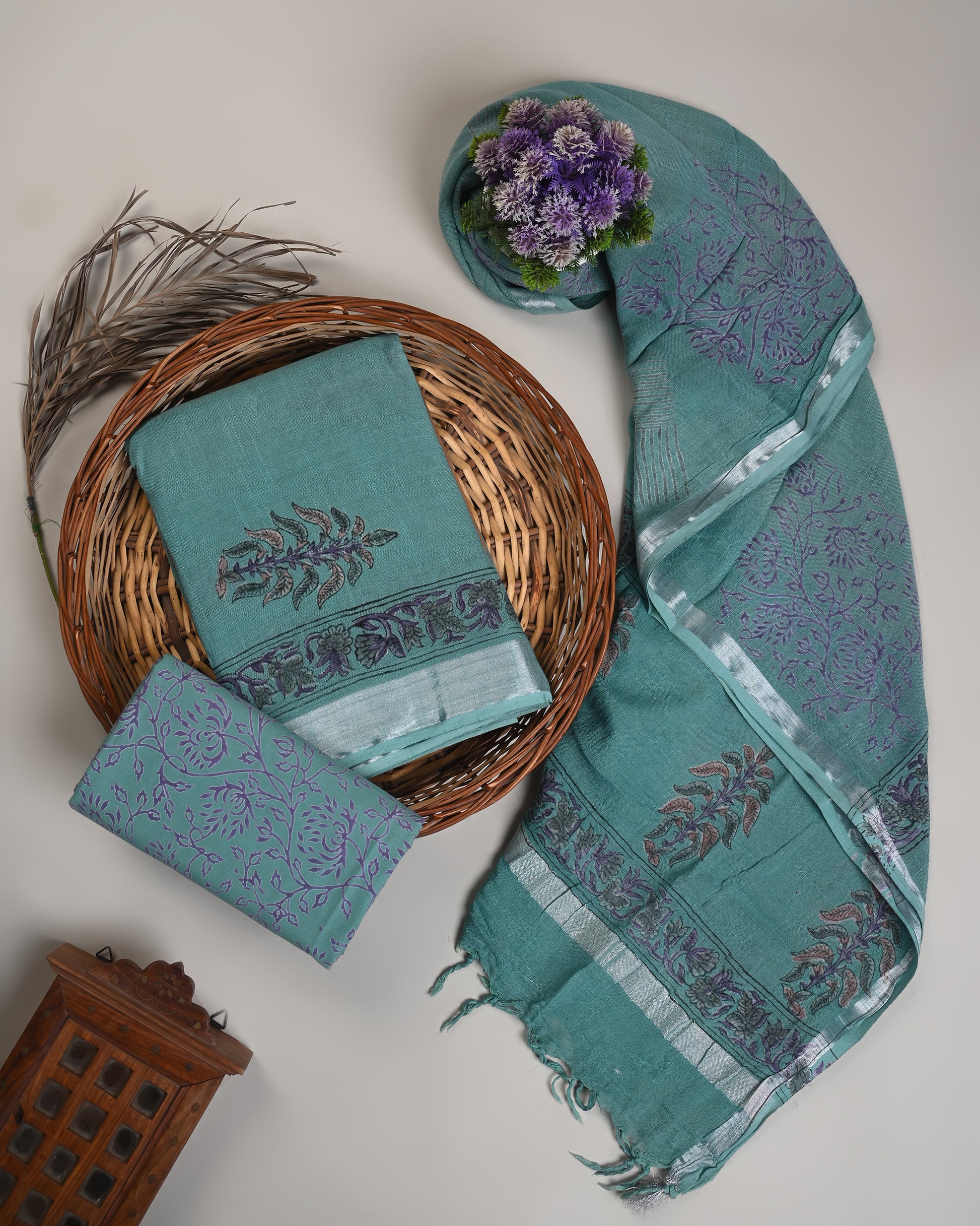 Our Linen Cotton Suit Set set includes a Top Bottom & Dupatta Set For Women featuring exquisite prints like Sanganeri Print, Bagru Print and Jaipuri Print. The Unstitched Printed Pure Cotton Dress Materials / Suit Fabric / Churidar Material  offers versatility, allowing you to create your own unique look