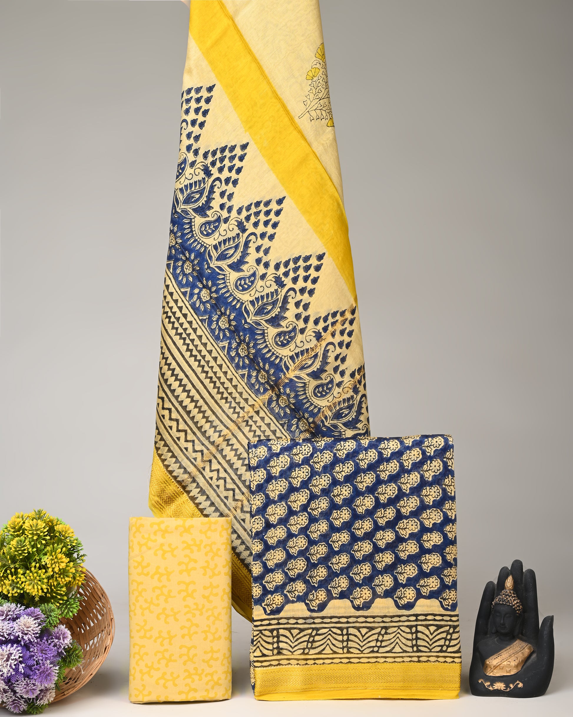 Yellow unstitched printed  pure cotton fabric or dress material top and bottom set for women for dress from tanchui having sangeneri print bagru print Jaipuri print