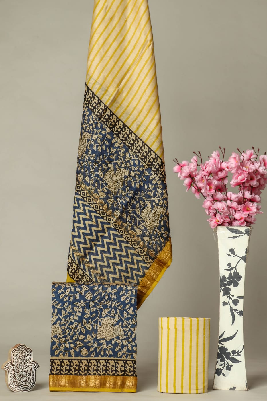 Yellow unstitched printed  pure cotton fabric or dress material top and bottom set for women for dress from tanchui having sangeneri print bagru print Jaipuri print