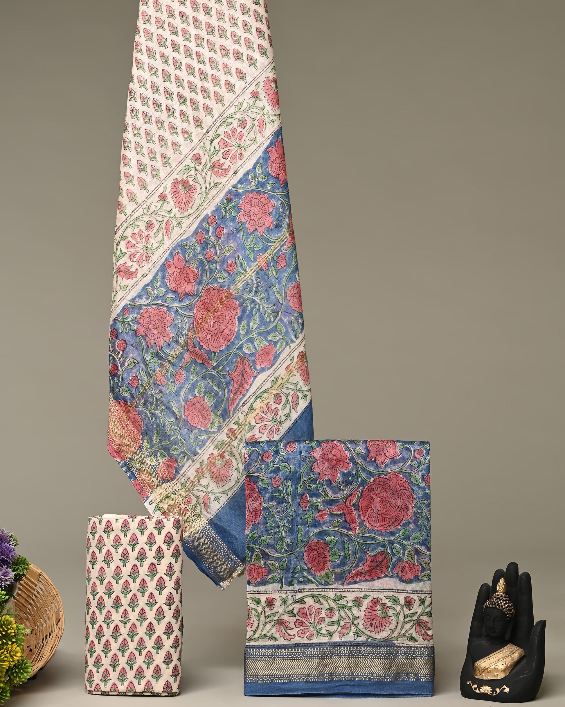 Blue unstitched printed pure cotton fabric or dress material top and bottom set for women for dress from tanchui having sangeneri print bagru print Jaipuri print