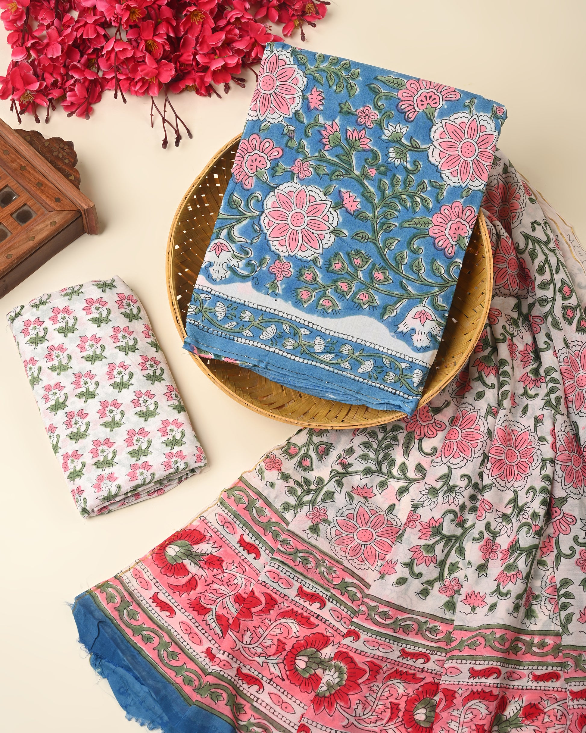 Blue unstitched printed pure cotton fabric or dress material top and bottom set for women for dress from tanchui having sangeneri print bagru print Jaipuri print