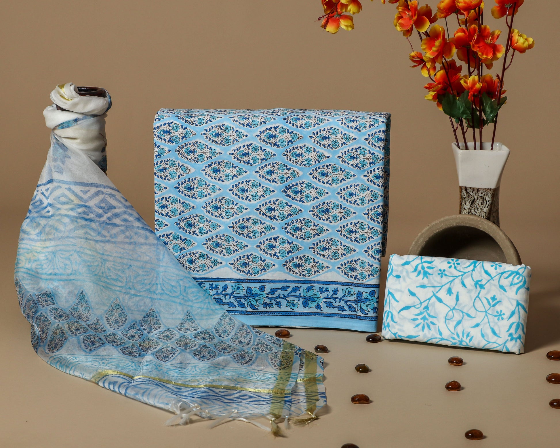 Blue unstitched printed pure cotton fabric or dress material top and bottom set for women for dress from tanchui having sangeneri print bagru print Jaipuri print