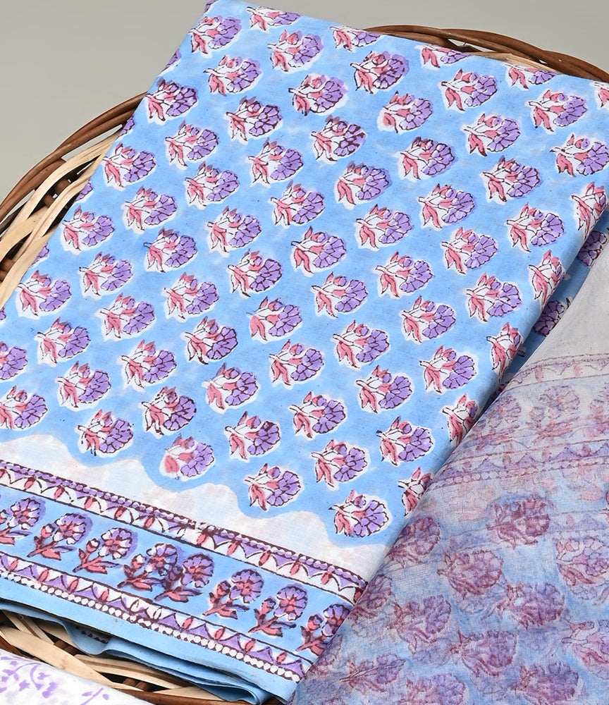 Blue unstitched printed pure cotton fabric or dress material top and bottom set for women for dress from tanchui having sangeneri print bagru print Jaipuri print