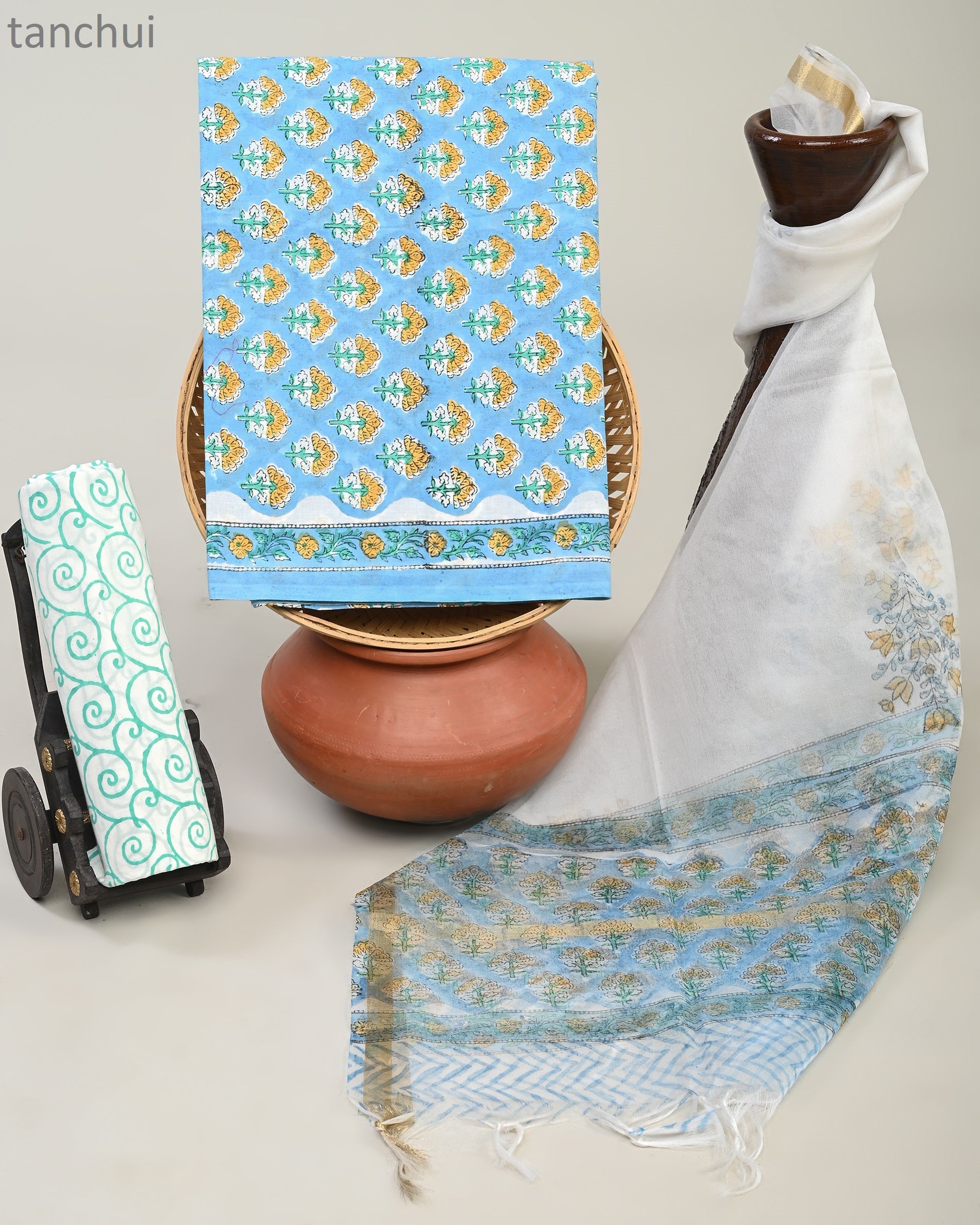 A Trending collection of ORGANZA DUPATTA COTTON SUIT with hand brush paint & hand block print to wear At Parties, Functions Or Just Casually Which Is Stylish & comfortable To Wear For Women. This Suit And You Will Be A Fashion Statement Every Time with Brand Of Tanchui.