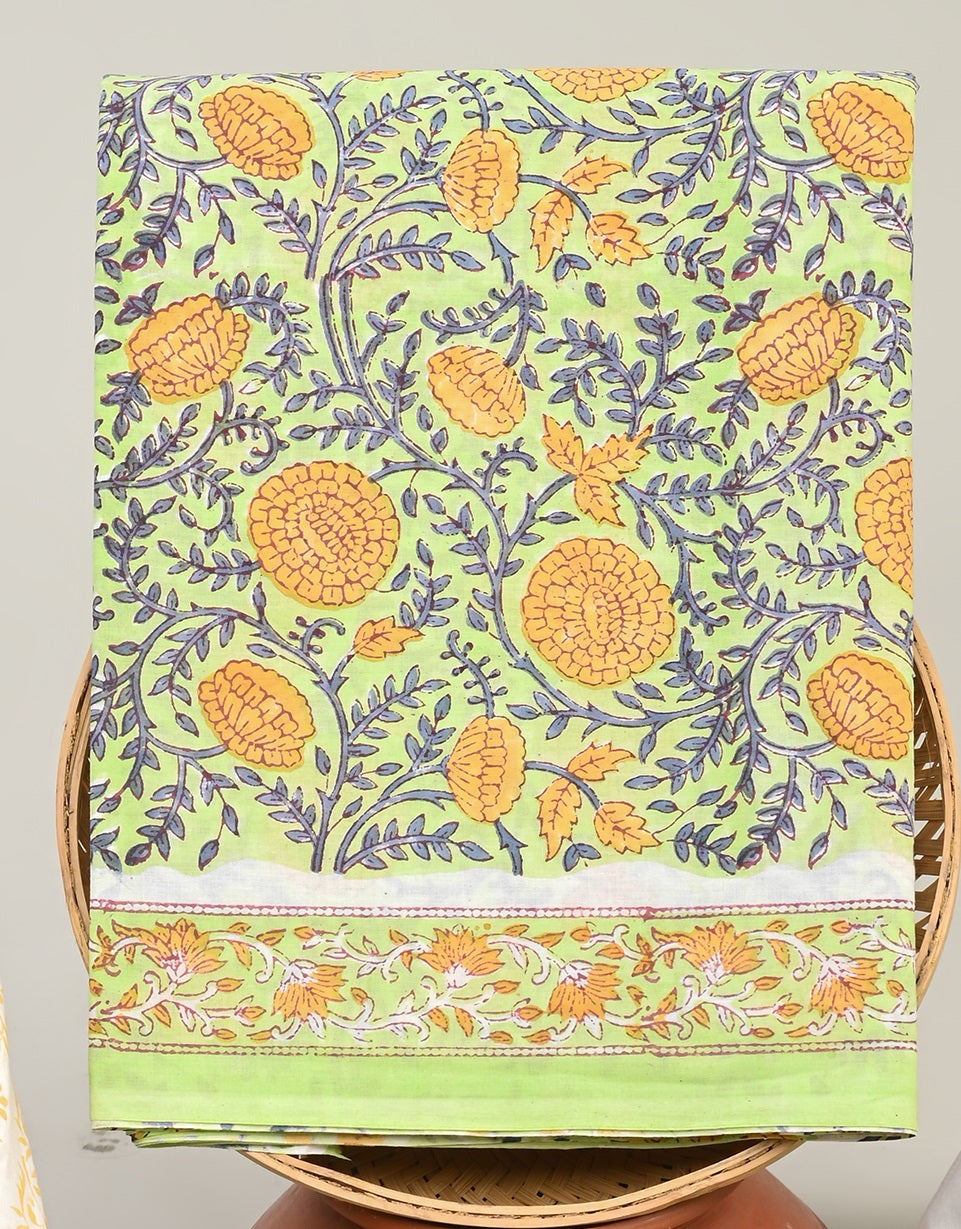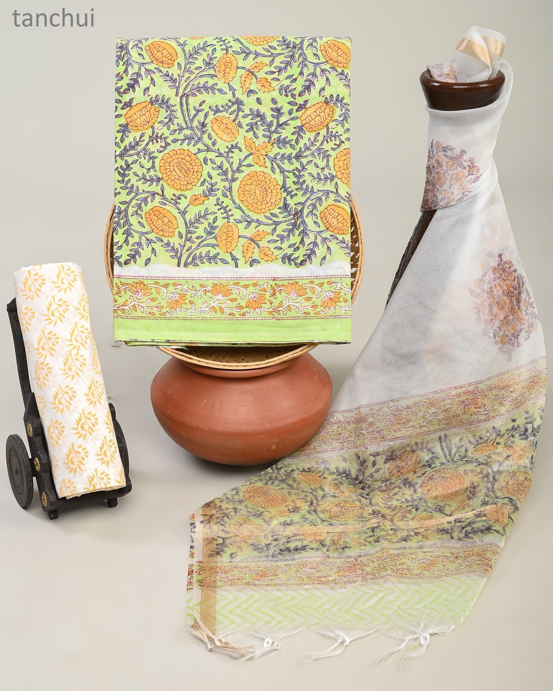 Green unstitched printed  pure cotton fabric or dress material top and bottom set for women for dress from tanchui having sangeneri print bagru print Jaipuri print