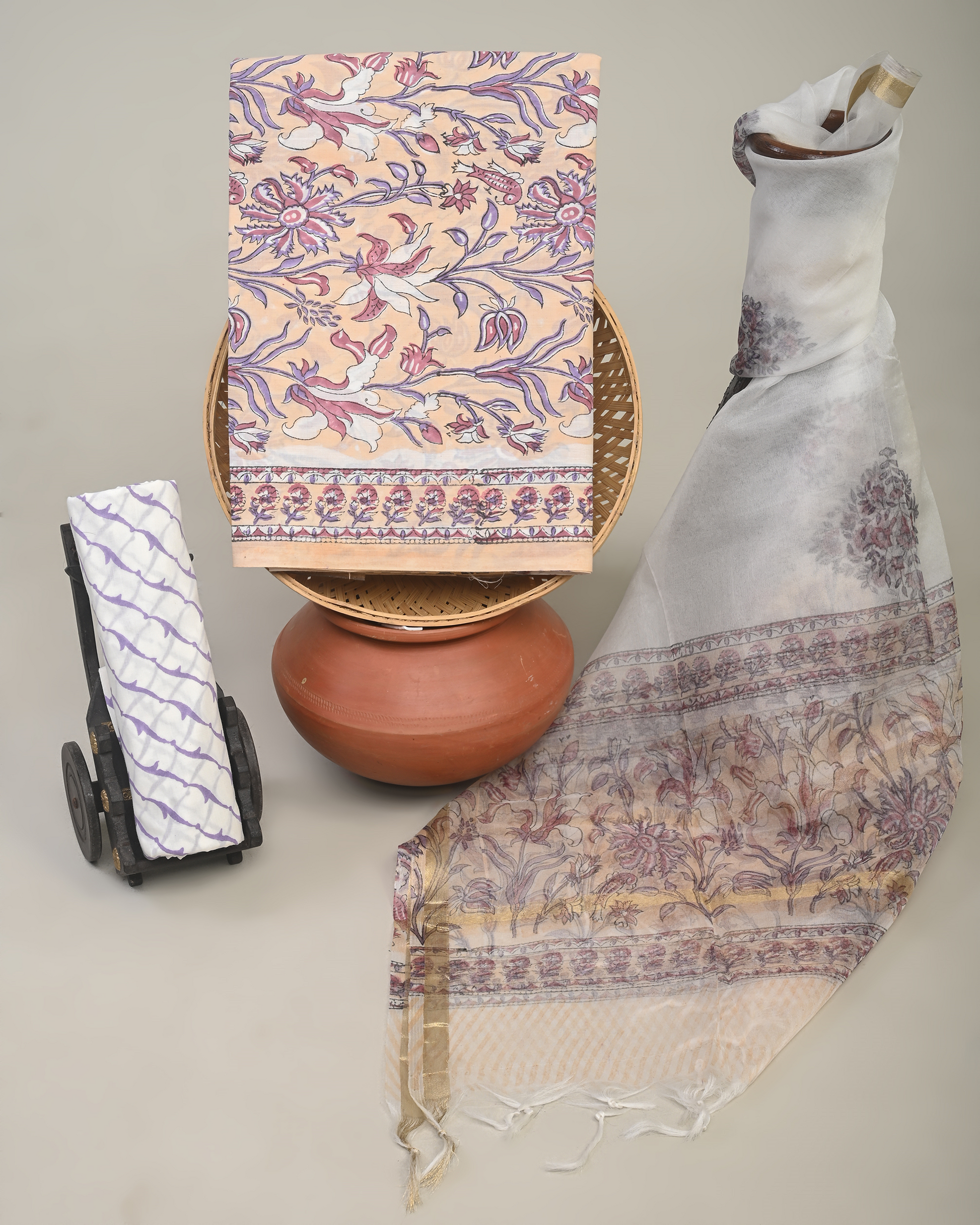 A Trending collection of ORGANZA DUPATTA COTTON SUIT with hand brush paint & hand block print to wear At Parties, Functions Or Just Casually Which Is Stylish & comfortable To Wear For Women. This Suit And You Will Be A Fashion Statement Every Time with Brand Of Tanchui.