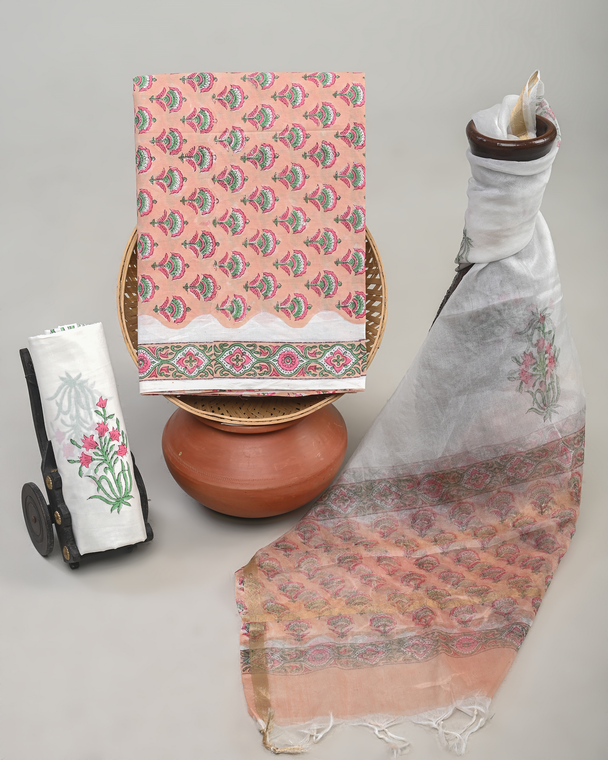 A Trending collection of ORGANZA DUPATTA COTTON SUIT with hand brush paint & hand block print to wear At Parties, Functions Or Just Casually Which Is Stylish & comfortable To Wear For Women. This Suit And You Will Be A Fashion Statement Every Time with Brand Of Tanchui.