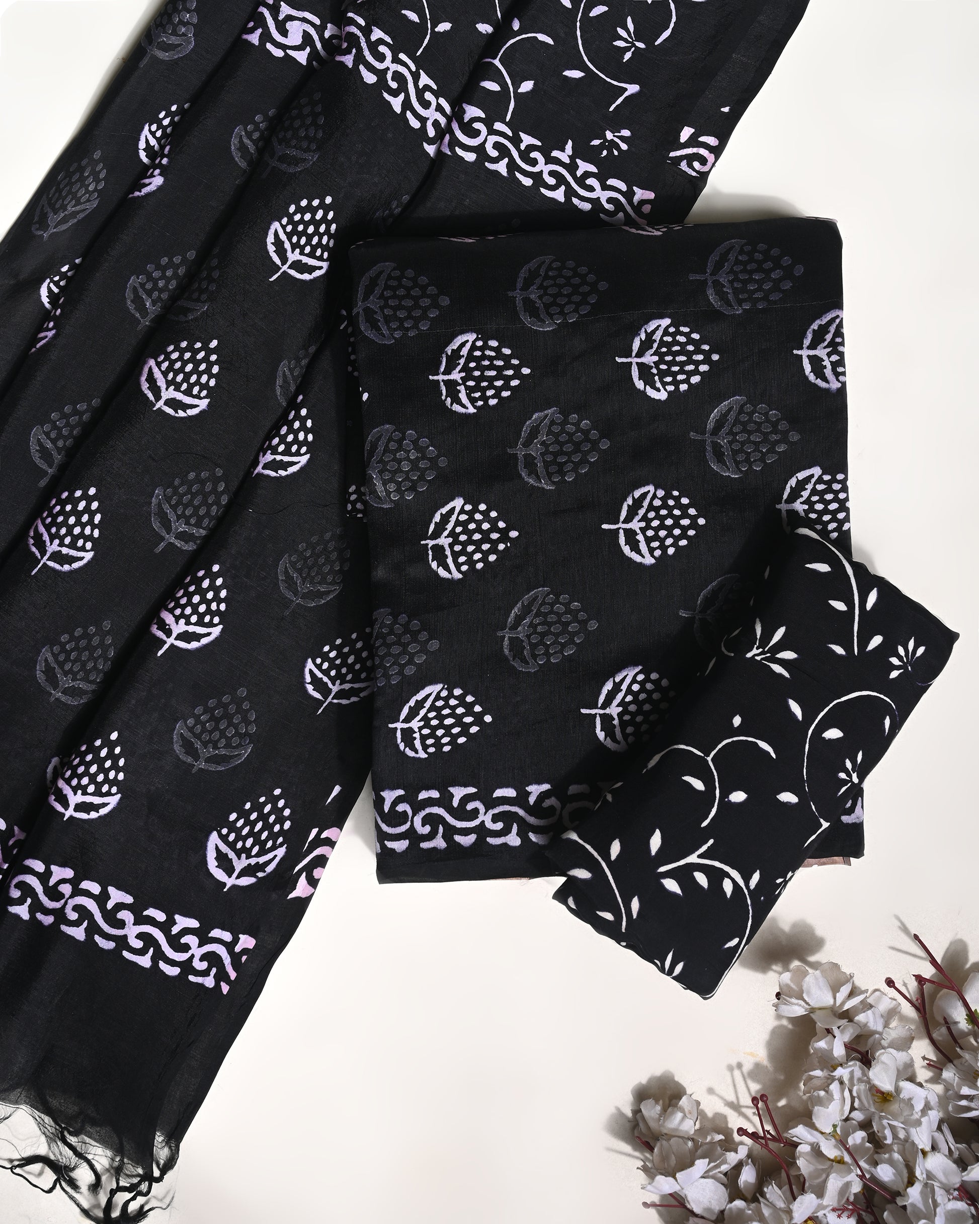 Black  unstitched printed pure cotton fabric or dress material top and bottom set for women for dress from tanchui having sangeneri print bagru print Jaipuri print